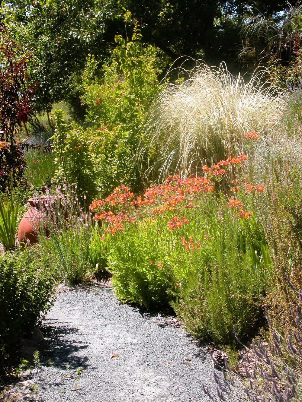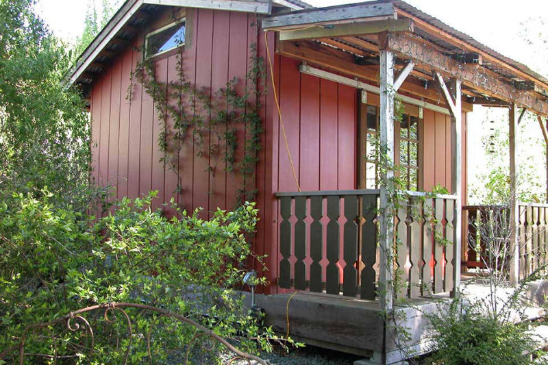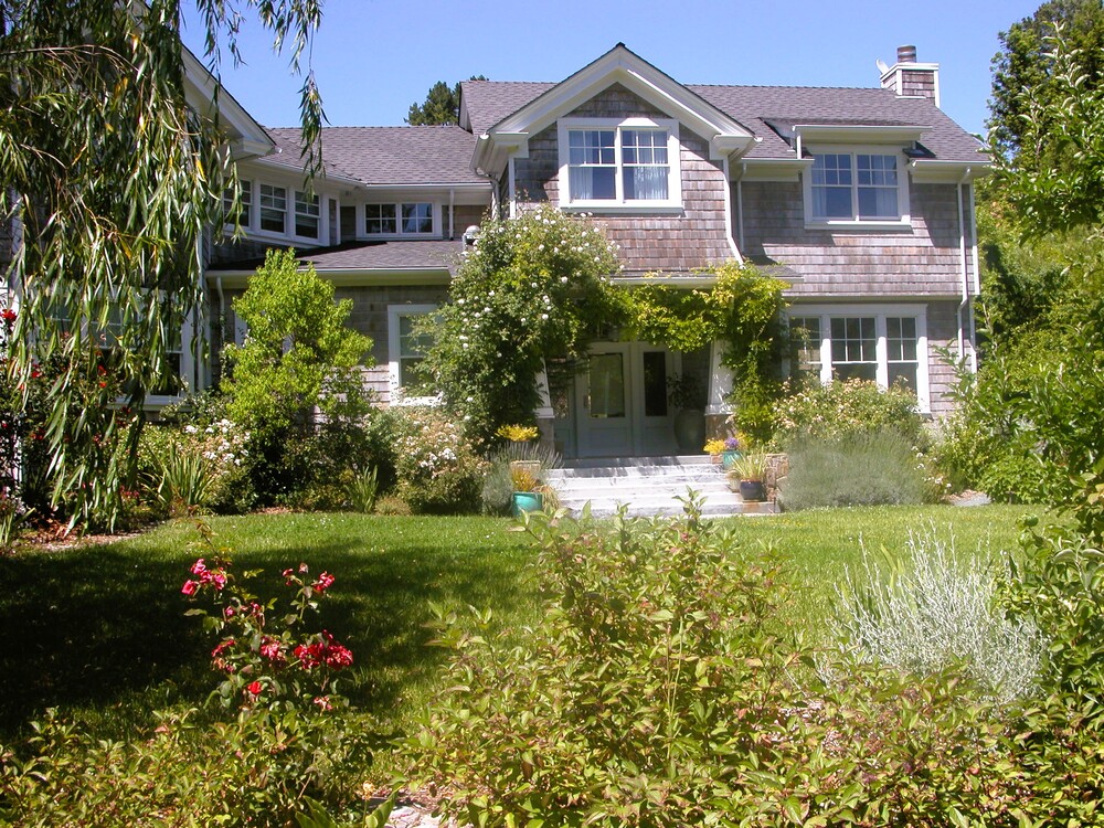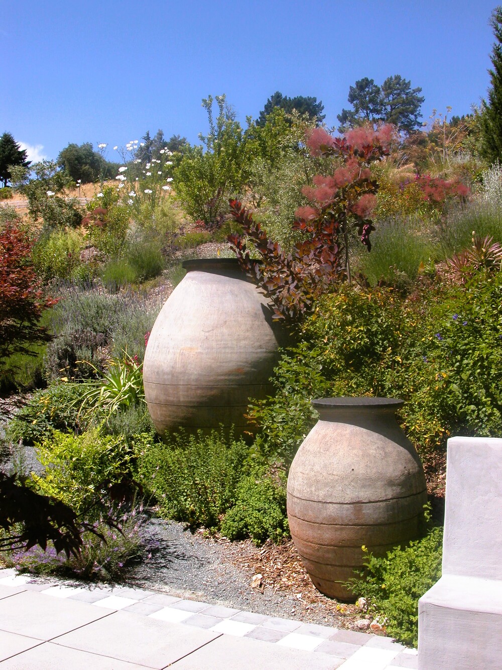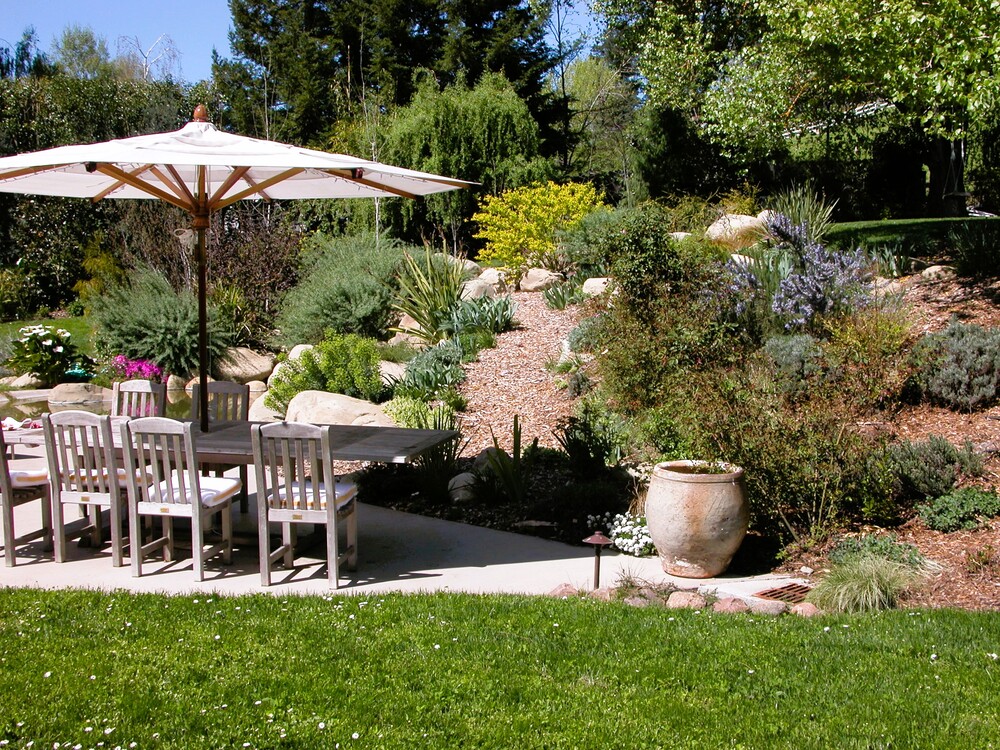 A young family desired that their brand-new home set in an empty lot develop a landscape that was relaxed, friendly and informal, much like an old country ranch. They also wanted a landscape that was bountiful with fruits to be picked and vegetables to be harvested, but with most of the plantings respectful of the hot, summer dry climate of the region. We created a landscape with a casual feel, and diversity of spaces for outdoor living, and a child-friendly layout. A hillside stream and pool/patio area, a more formal dining terrace, and a children’s playhouse were also created.