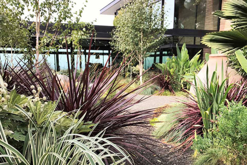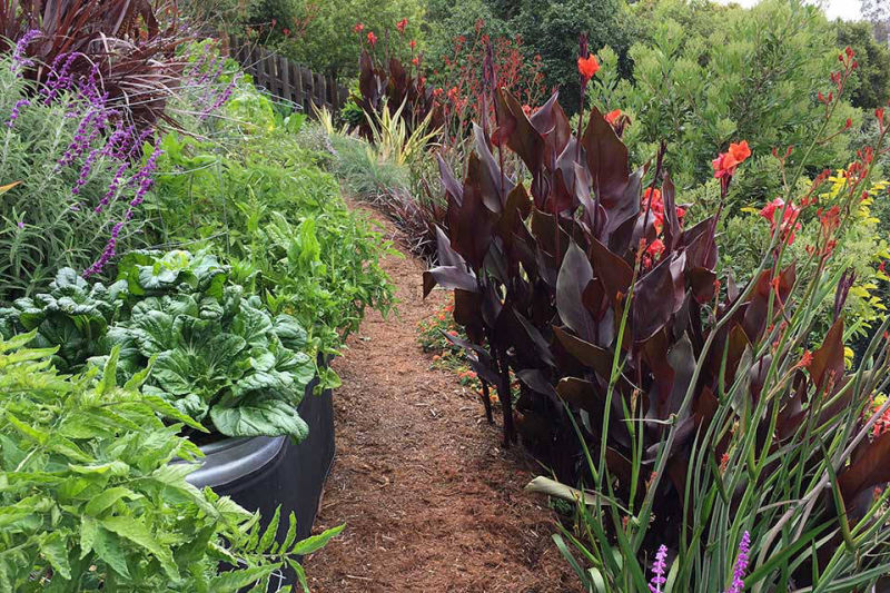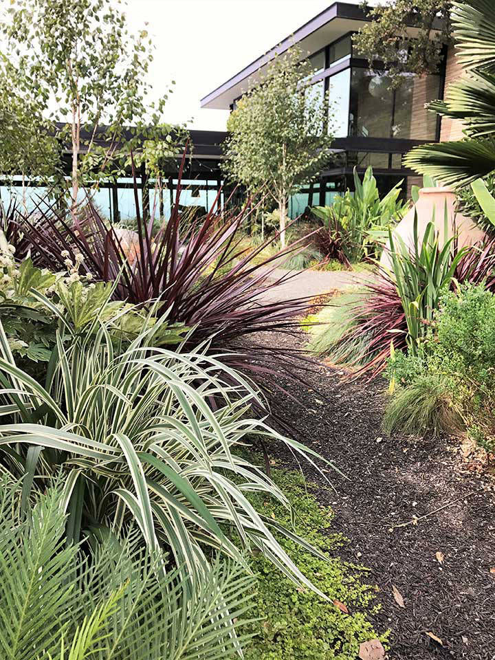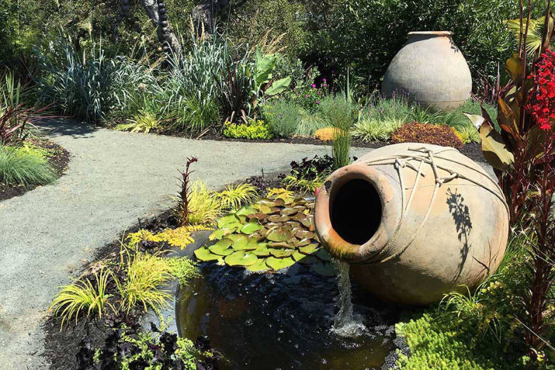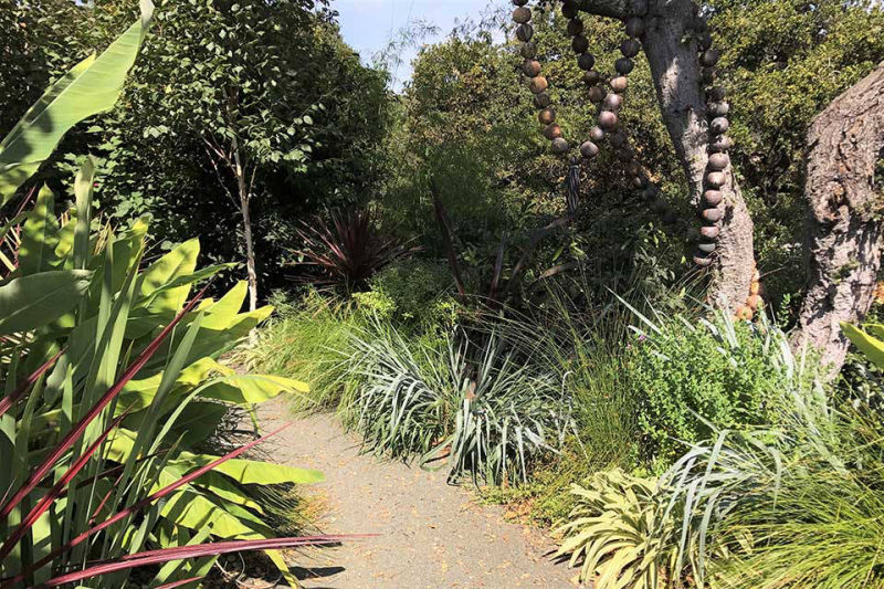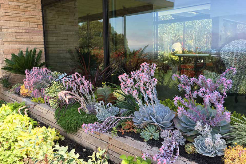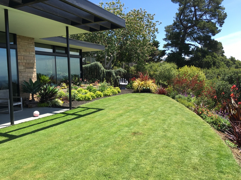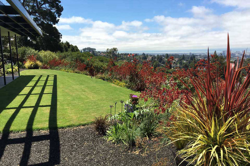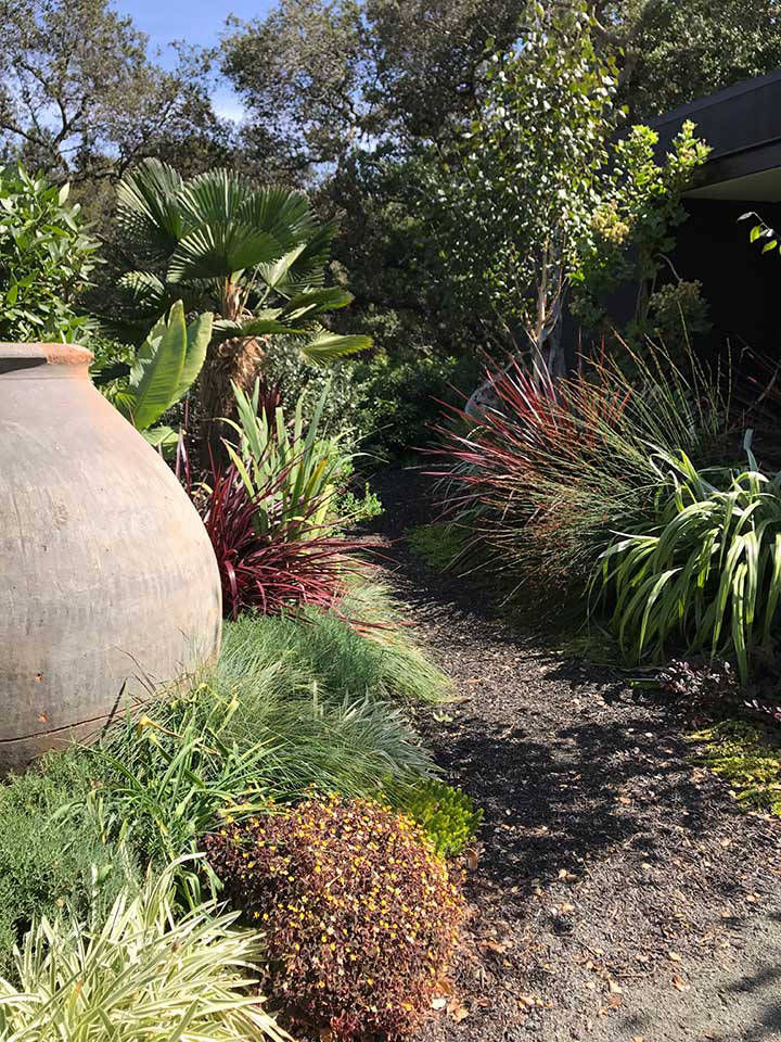Friends and previous clients bought a mid-century modern house located on the top of a ridge in the Claremont area of Berkeley CA. It has panoramic views of the San Francisco Bay, the Peninsula, San Francisco, the Golden Gate Bridge, the Bay Bridge and Marin County. The owners renovated the house maintaining the architectural heritage of the building. The wanted to create a garden that would feel contemporary, provide circulation and access, lots of edible plants, spaces for their sculptures, and outdoor living spaces. Several choice specimen plants and antique ceramic urns were brought from their previous garden in Mill Valley, California.
