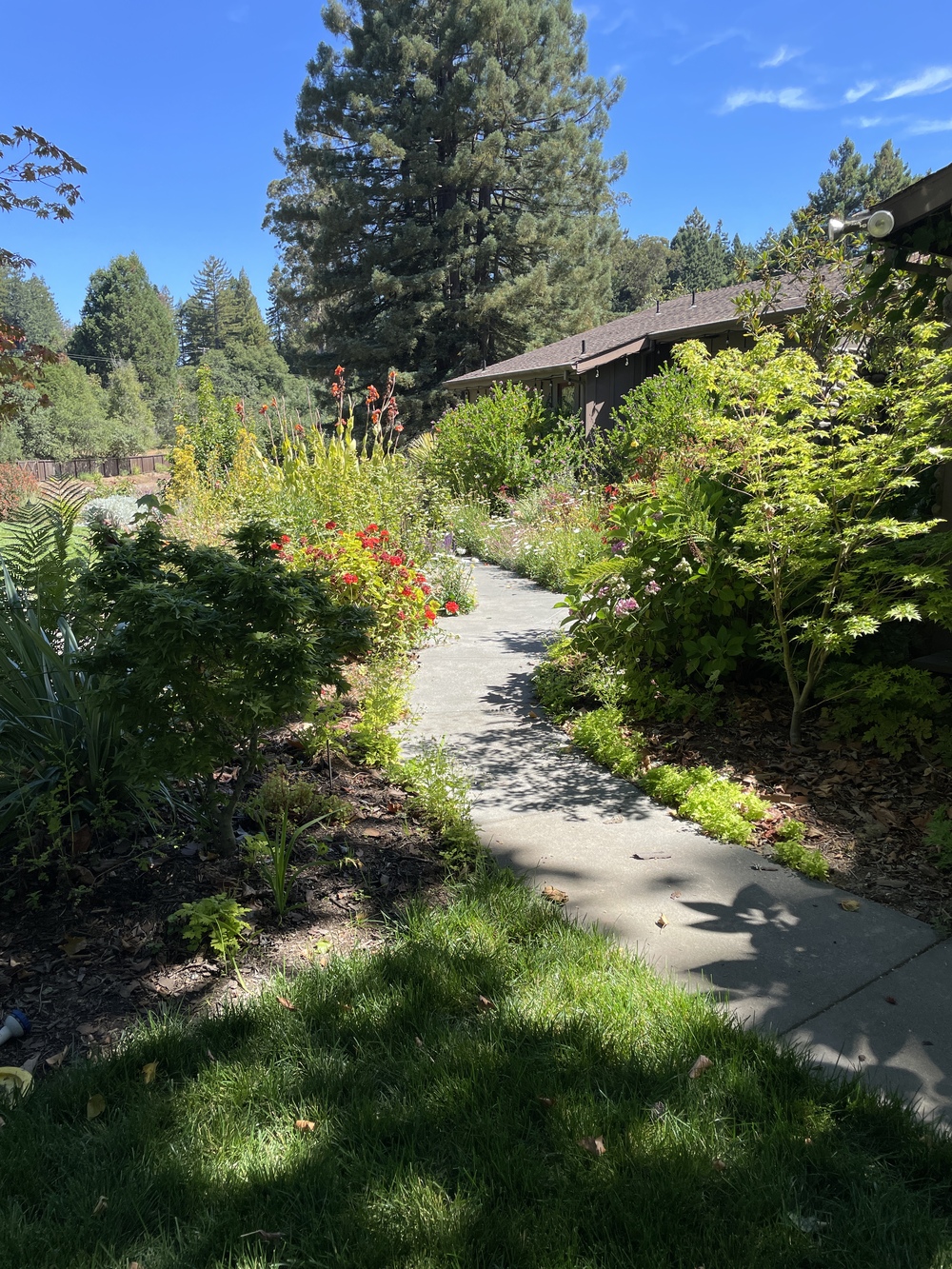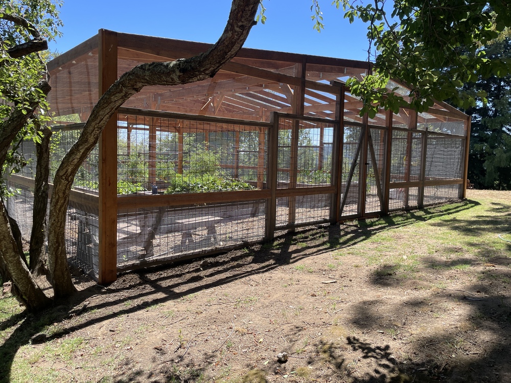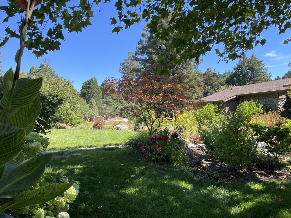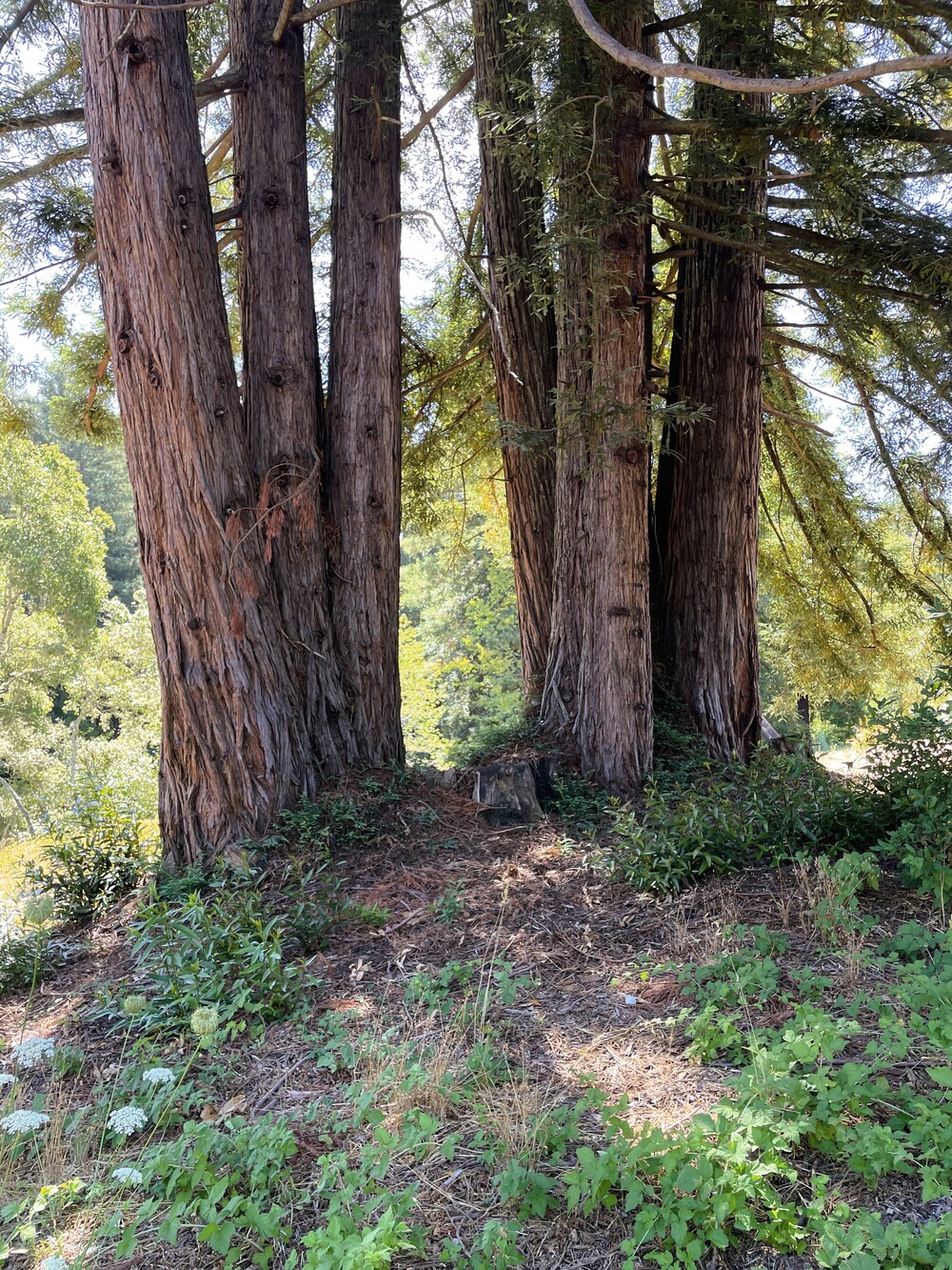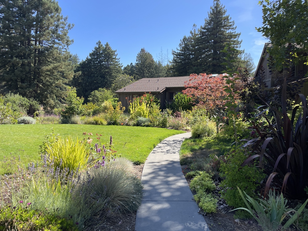 A multigenerational family owns this ranch, with residences in a central area surrounded by towering redwoods and meadows. Before our arrival, the property was divided into various paddocks and fenced areas for livestock. We aimed to unify the family-use areas and link them in a reconceived circulation system, adding a large lawn area surrounding the living spaces in extended garden borders. Other new amenities included a multi-shot single-hole golf area, a chicken coop, and a vegetable area protected by wire mesh on a frame that protected the ground, sides and roof from rodents, other mammals and birds. We created a rustic, contoured road system to provide vehicular access for maintenance and recreation. Narrower trails were added for walking or biking through the ancient redwood forest and steep slopes. A rustic grape stake fence and automated gate were put along the road to offer greater privacy. Vegetation management included tree and fire-prone shrub thinning and forestry mulching. New fruit trees and various colorful plants were set out in our classic, supernaturalistic style.