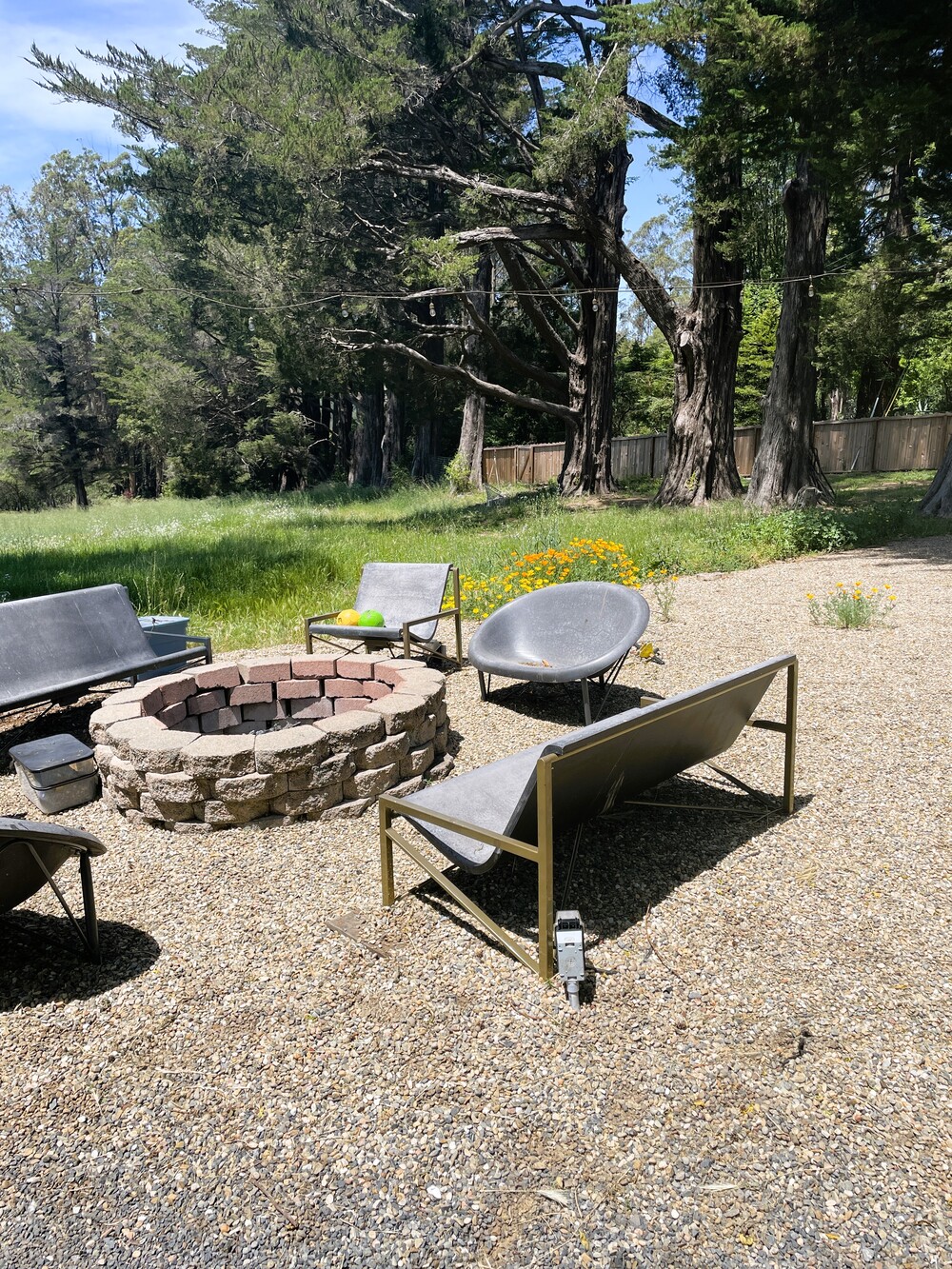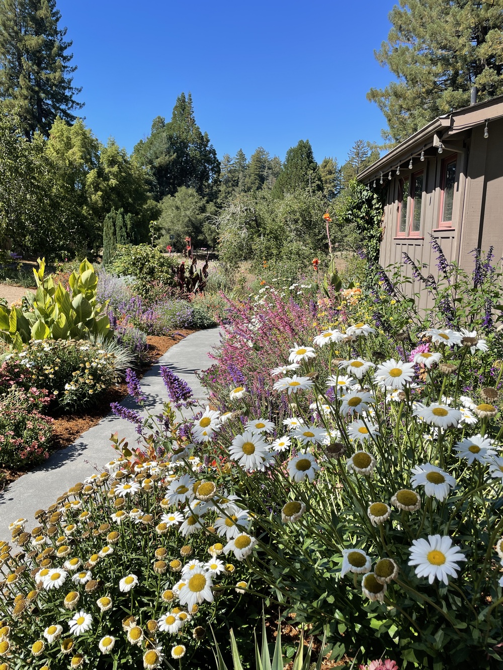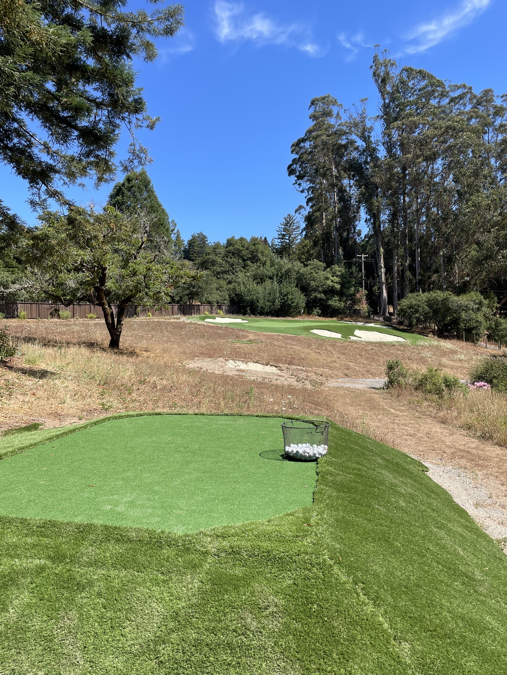 A multigenerational family owns this ranch, with residences in a central area surrounded by towering redwoods and meadows. Before our arrival, the property was divided into various paddocks and fenced areas for livestock. We aimed to unify the family-use areas and link them in a reconceived circulation system, adding a large lawn area surrounding the living spaces in extended garden borders. Other new amenities included a multi-shot single-hole golf area, a chicken coop, and a vegetable area protected by wire mesh on a frame that protected the ground, sides and roof from rodents, other mammals and birds. We created a rustic, contoured road system to provide vehicular access for maintenance and recreation. Narrower trails were added for walking or biking through the ancient redwood forest and steep slopes. A rustic grape stake fence and automated gate were put along the road to offer greater privacy. Vegetation management included tree and fire-prone shrub thinning and forestry mulching. New fruit trees and various colorful plants were set out in our classic, supernaturalistic style.
