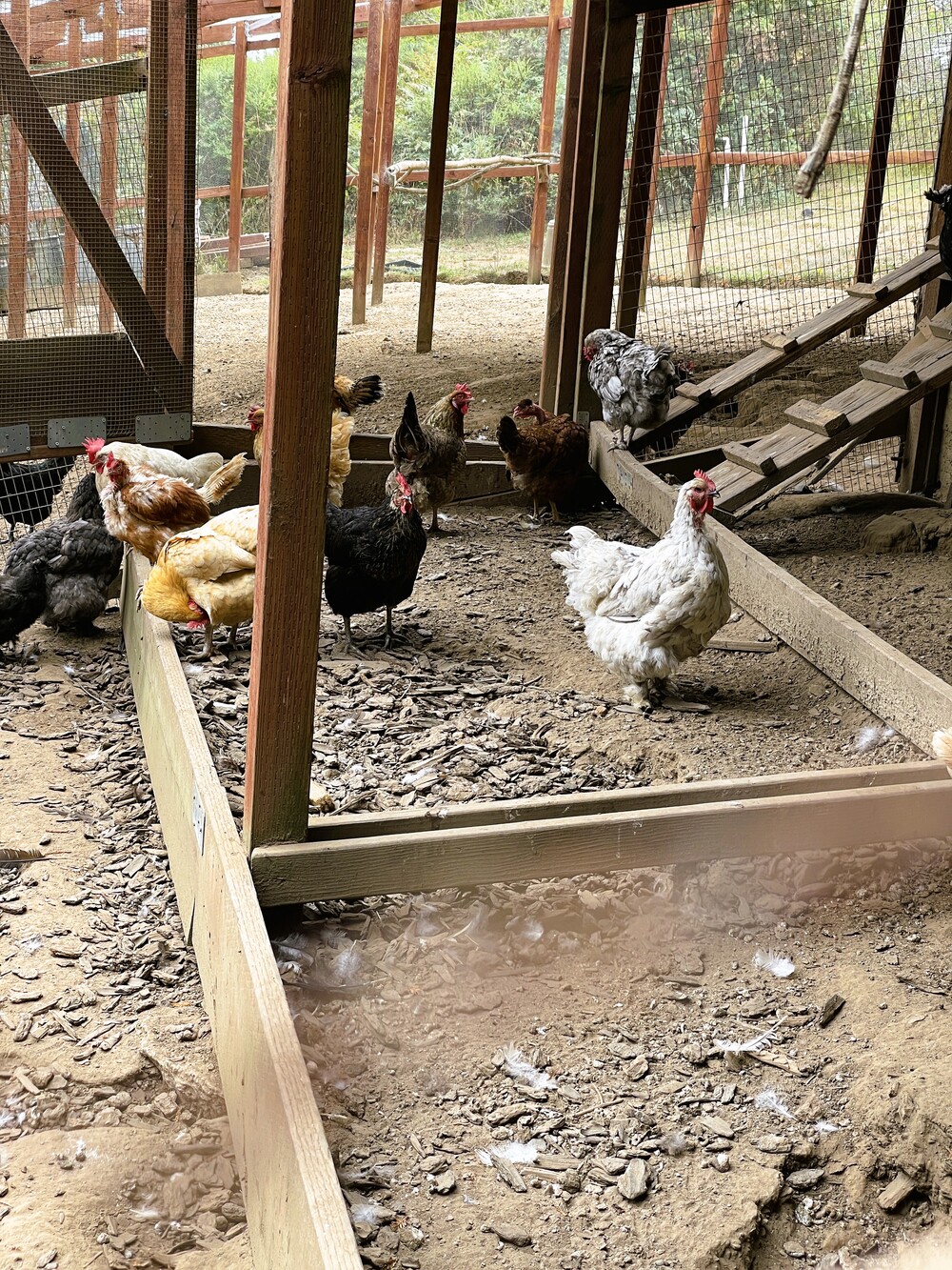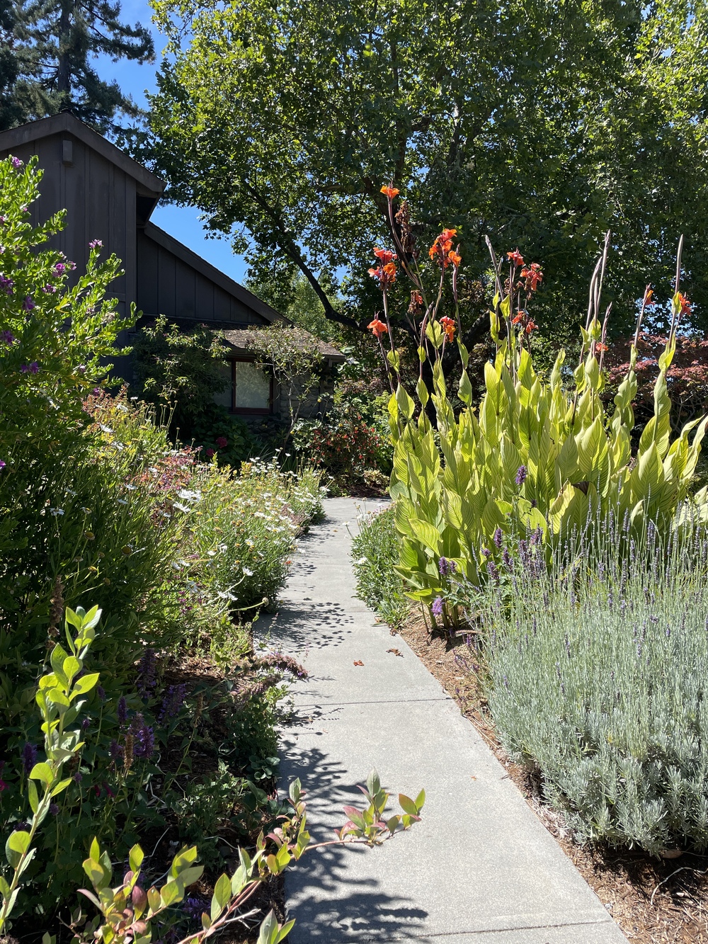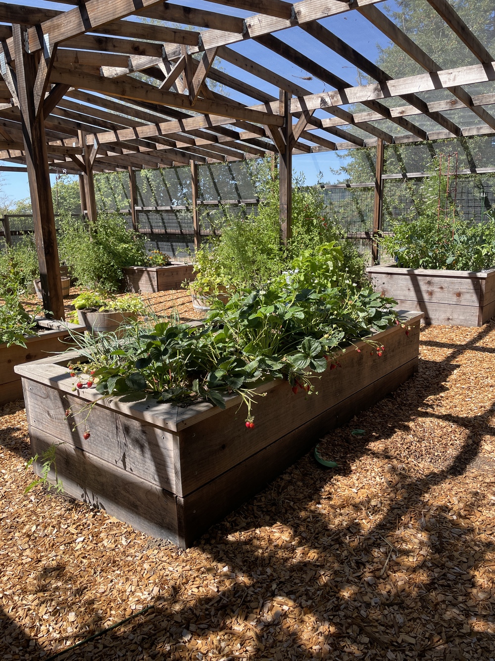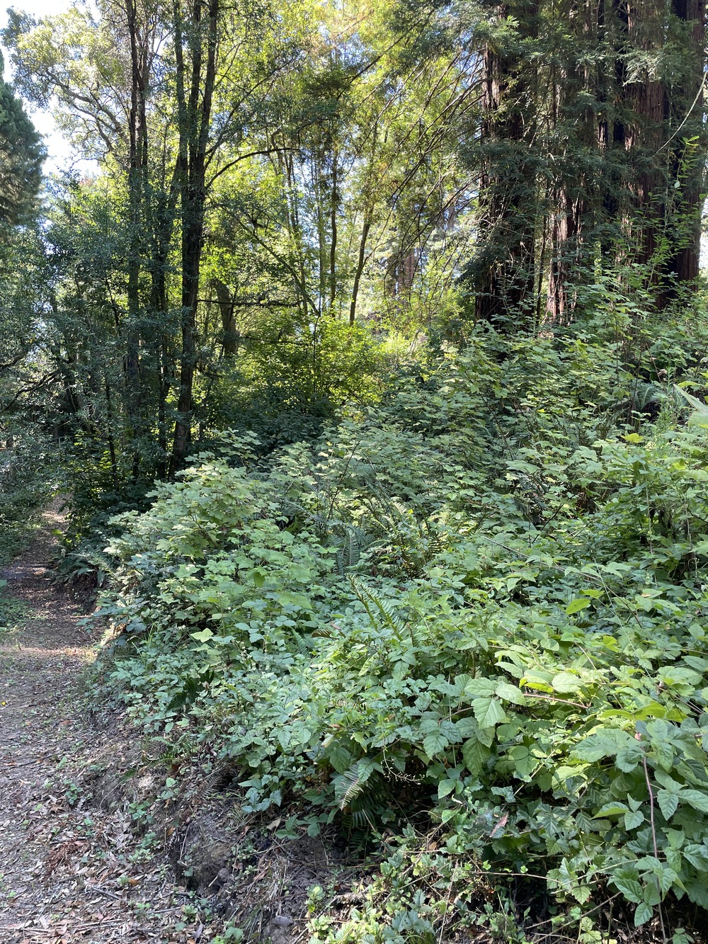 A multigenerational family owns this ranch, with residences in a central area surrounded by towering redwoods and meadows. Before our arrival, the property was divided into various paddocks and fenced areas for livestock. We aimed to unify the family-use areas and link them in a reconceived circulation system, adding a large lawn area surrounding the living spaces in extended garden borders. Other new amenities included a multi-shot single-hole golf area, a chicken coop, and a vegetable area protected by wire mesh on a frame that protected the ground, sides and roof from rodents, other mammals and birds. We created a rustic, contoured road system to provide vehicular access for maintenance and recreation. Narrower trails were added for walking or biking through the ancient redwood forest and steep slopes. A rustic grape stake fence and automated gate were put along the road to offer greater privacy. Vegetation management included tree and fire-prone shrub thinning and forestry mulching. New fruit trees and various colorful plants were set out in our classic, supernaturalistic style.